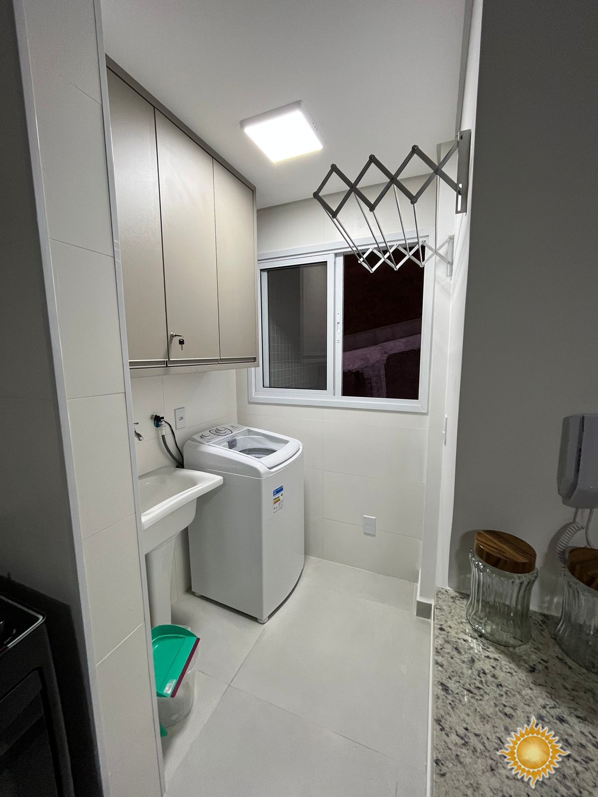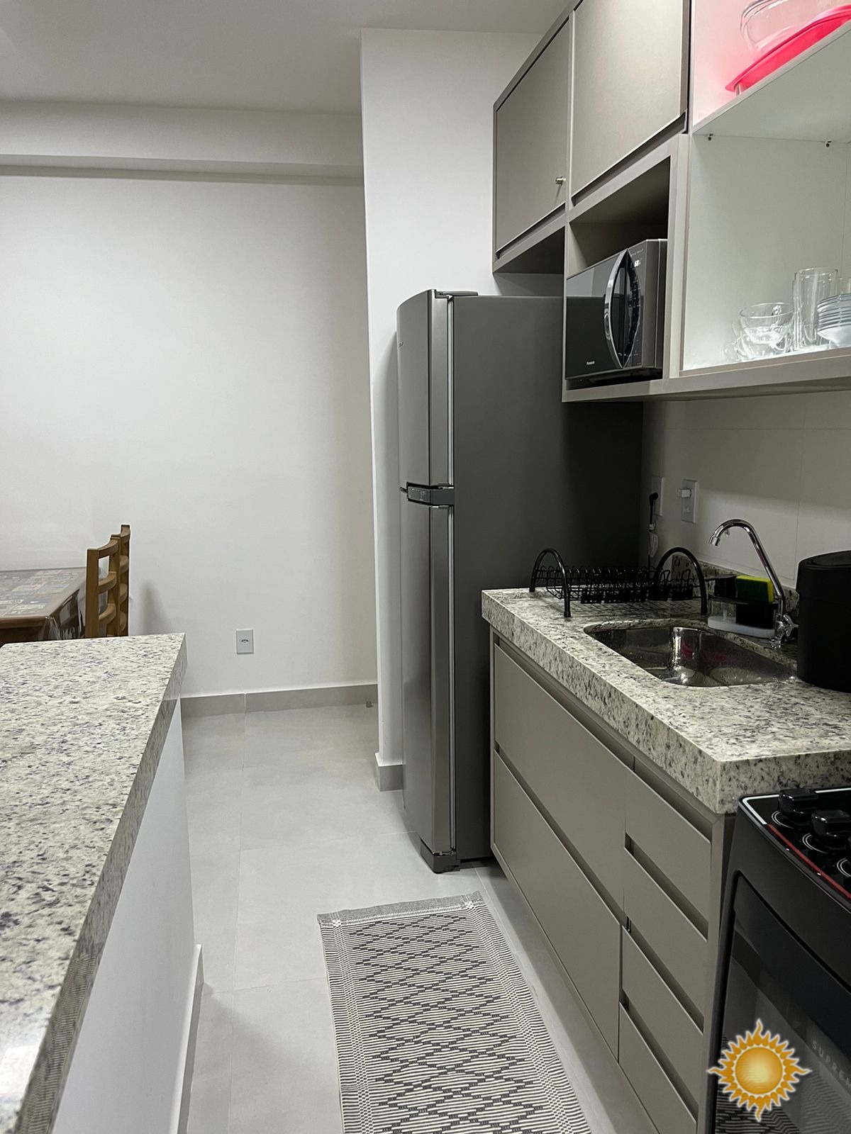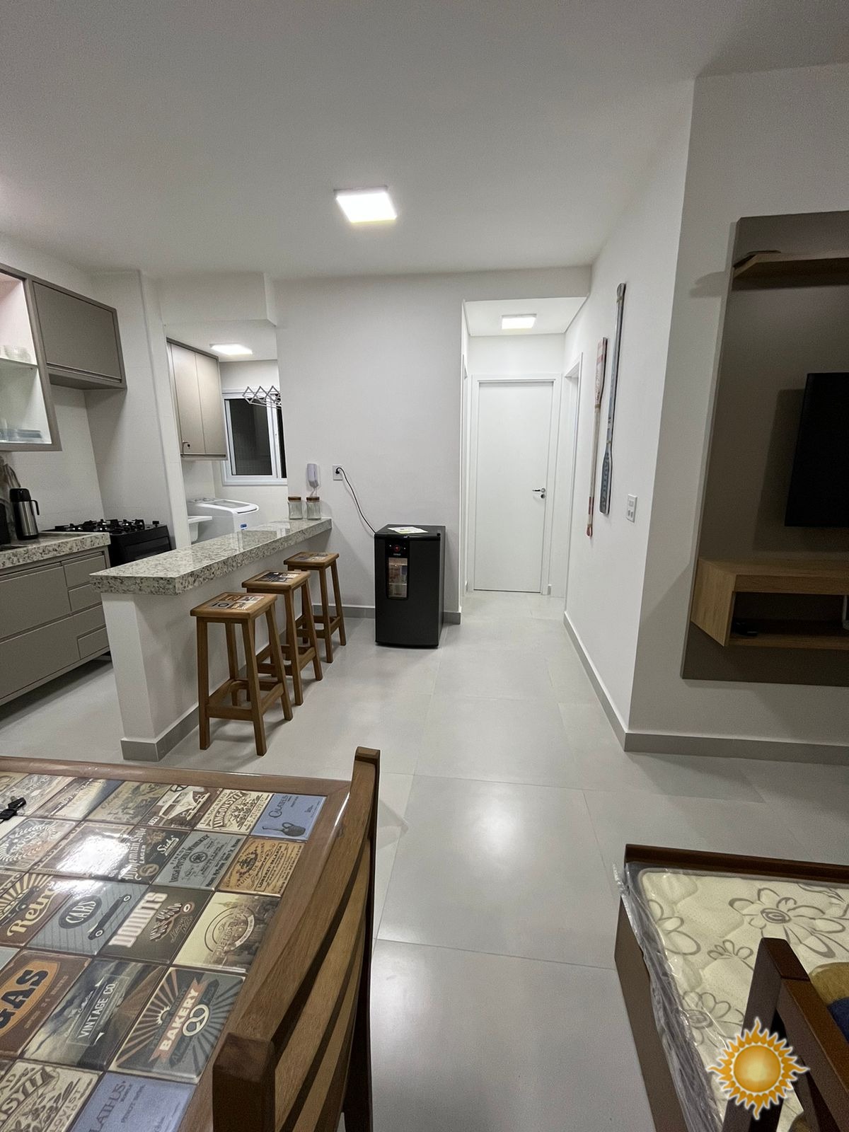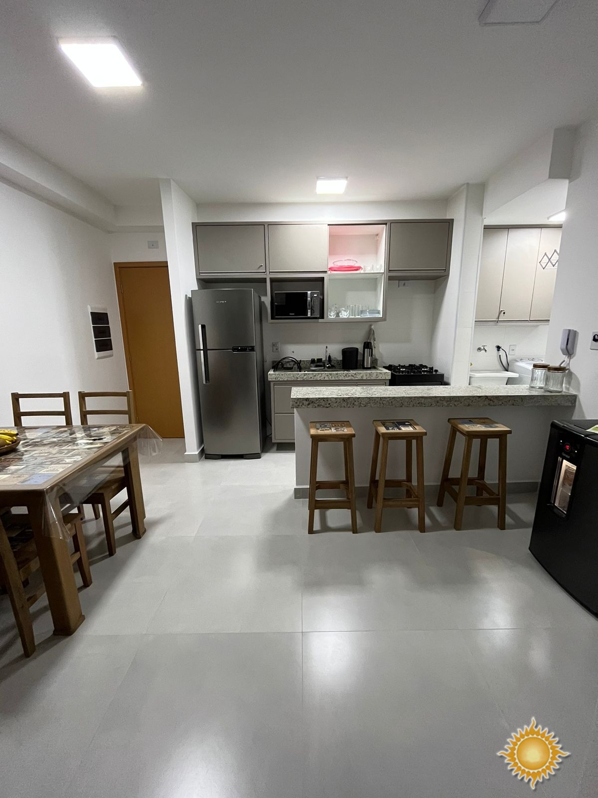 Possui 2 dormitórios com armários, sendo 1 suíte, 01 banheiro social, sala de jantar, sala de estar, cozinha planejada com balcão americano, área de serviço com armário, varanda gourmet, garagem coberta com espaço para até 1 veículo.