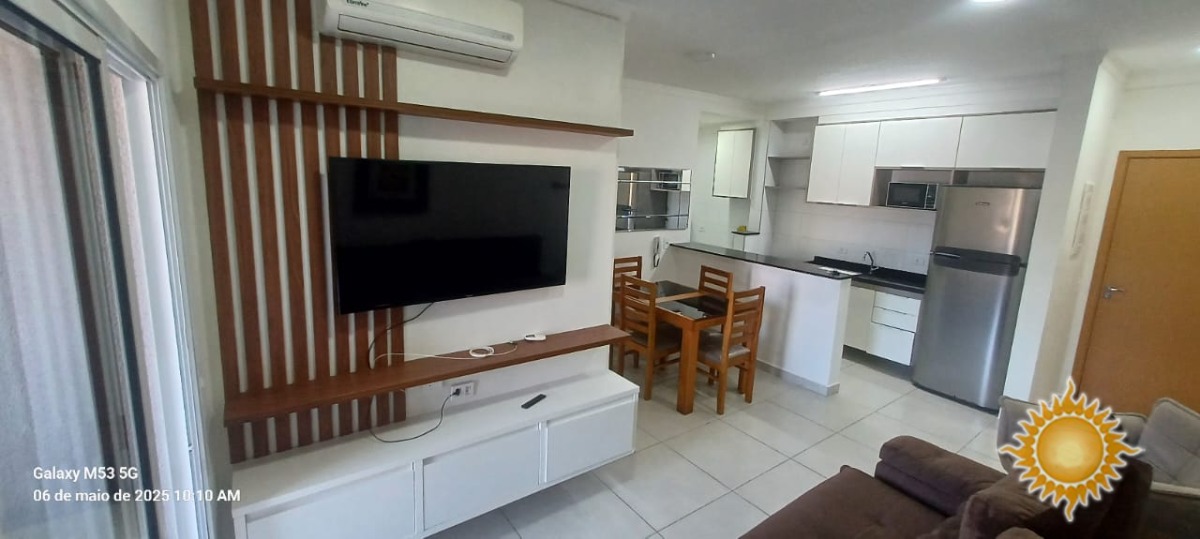 Possui 1 dormitório com armário, ventilador de teto e ar condicionado, 1 banheiro, sala de jantar, sala de estar, armários de cozinha,